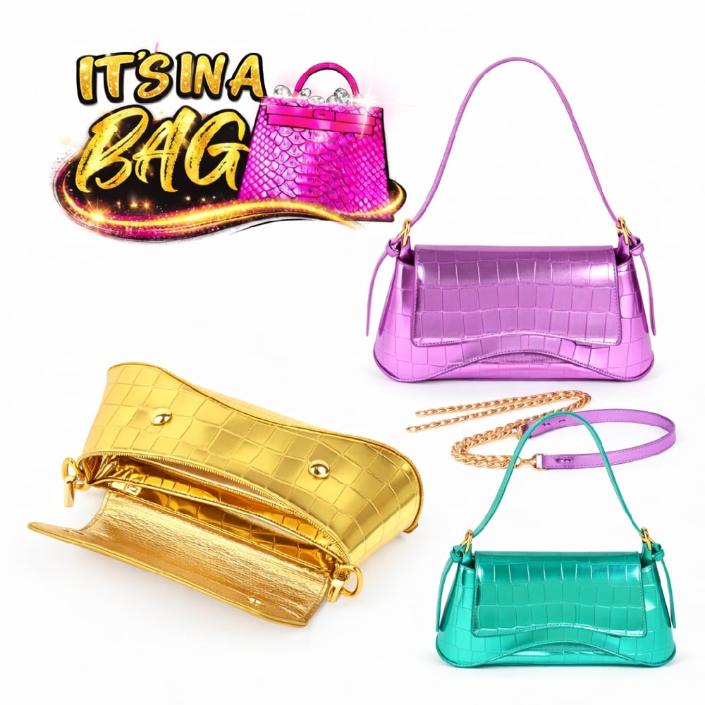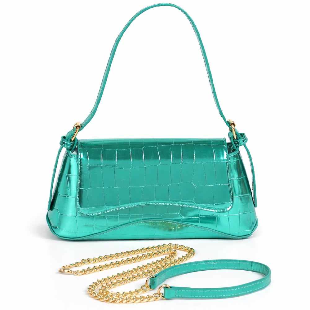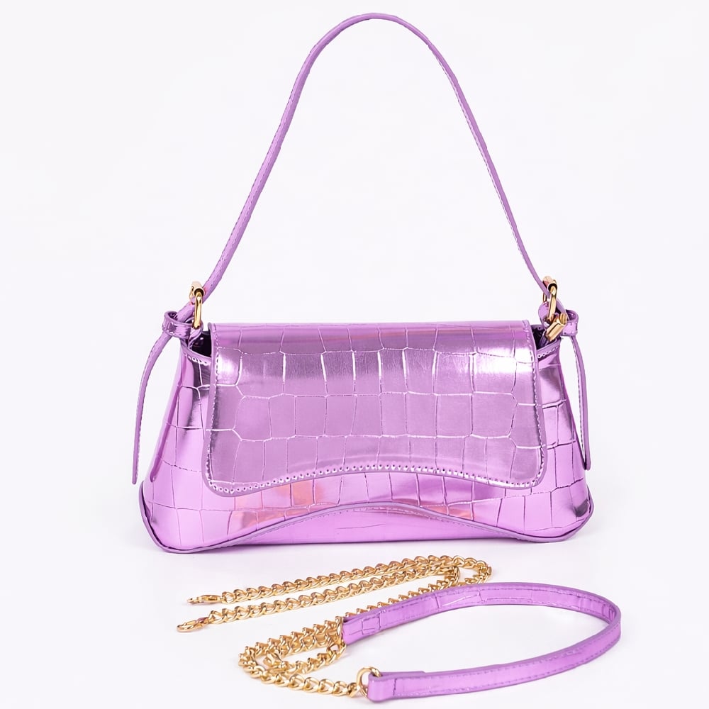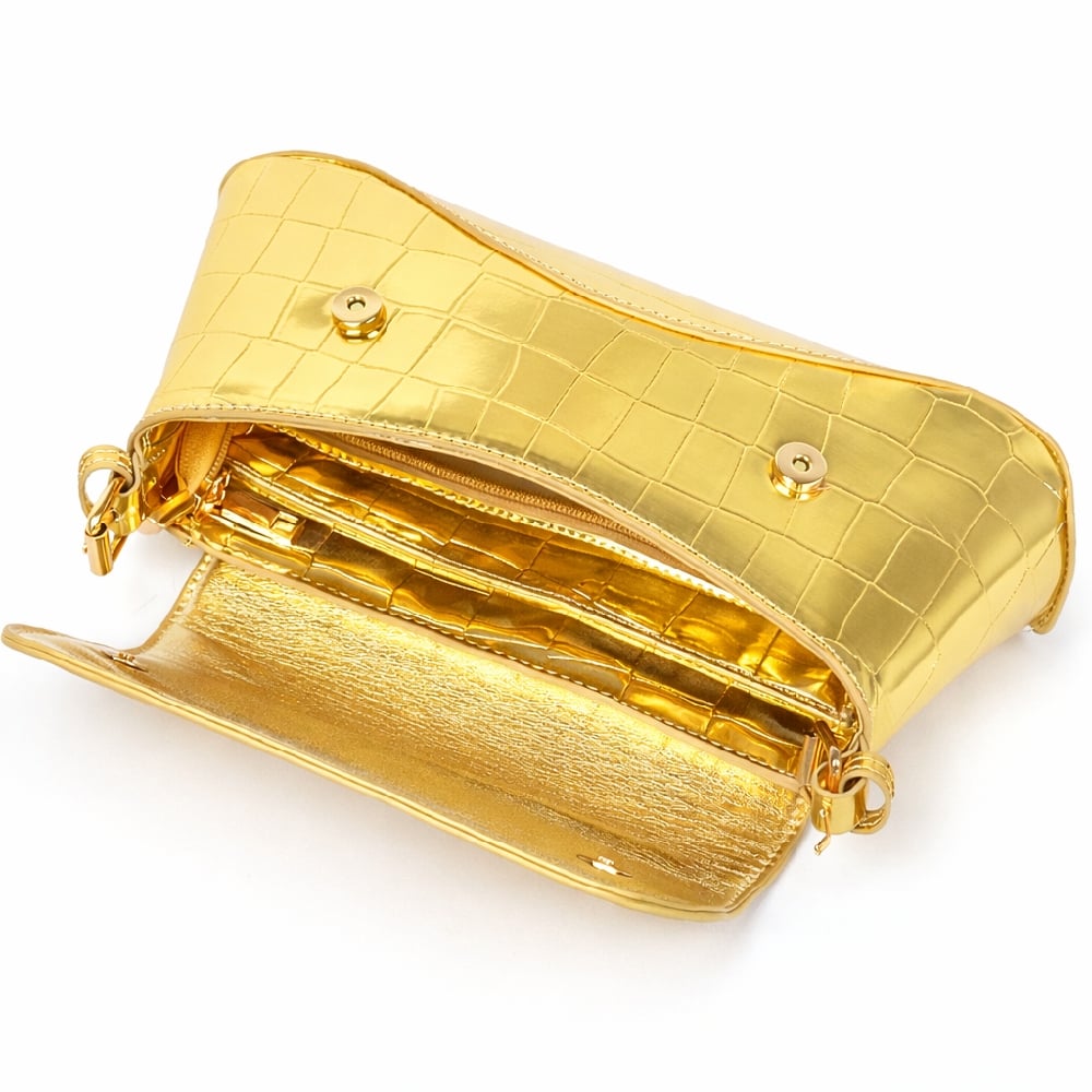 Croc-embossed metallic, shoulder clutch handbag.