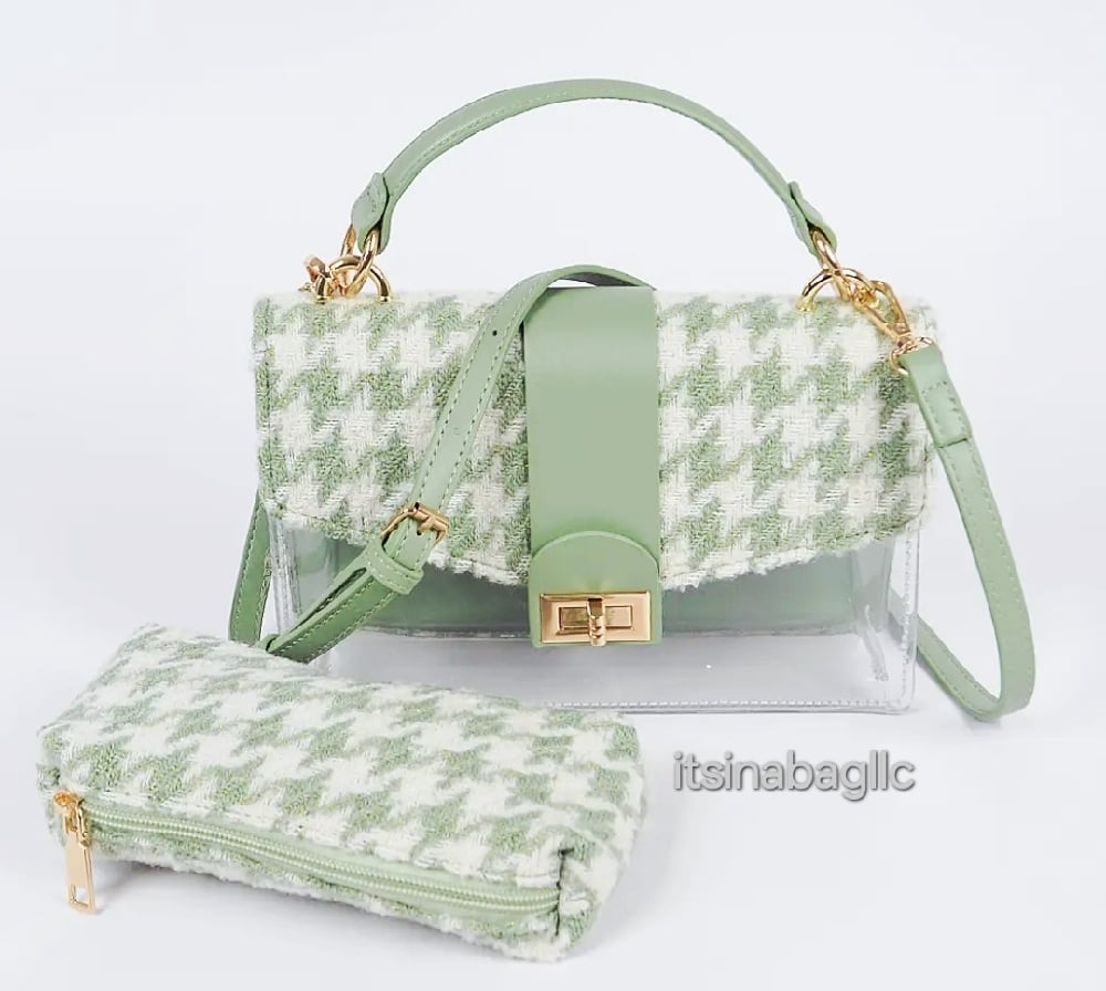 Houndstooth tweed handbag with clear bottom. Crossbody friendly.